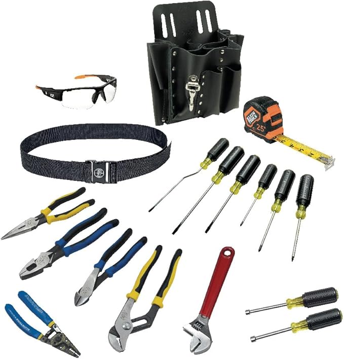 | Included Components | 8” Long Nose Pliers, 10” Pump Adjustable Wrench, #1 Phillips Screwdriver 3” Shank, #2 Wire Bending Screwdriver, 1/4” Cabinet Tip 4” 6” Nutdriver Shaft, 5/16” Square 4”Shank, 3/16” Rapi Dri® 25′ Tape Measure, 9” Lineman’s Angled 10 Pocket Tool Pouch, 54” L x 2” W Web Work Belt, to 18 Solid and 12 20 AWG Stranded Stripper, Protective Eyewear |
